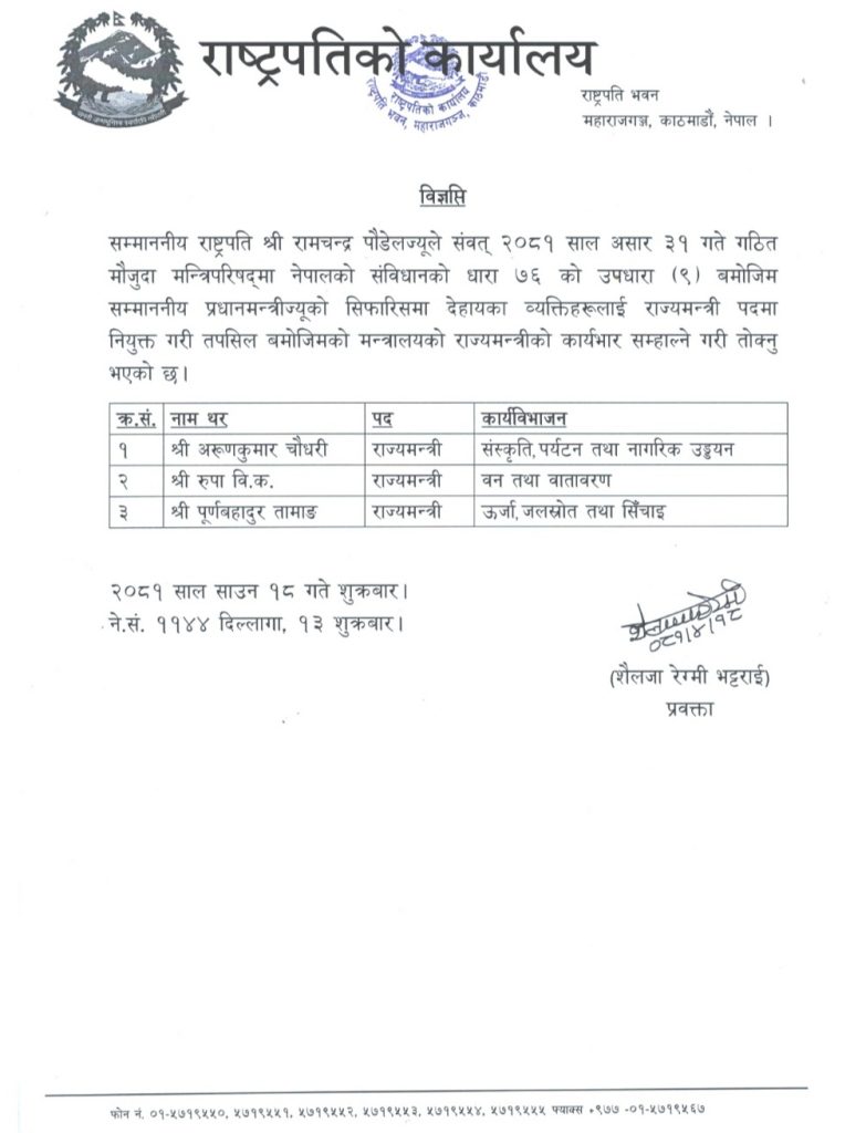 यस्तै कांग्रेसका रुपा बिक वन राज्यमन्त्री र पूर्णबहादुर तामाङ (कान्छाराम) ऊर्जा राज्यमन्त्री नियुक्त भएका छन् । प्रधानमन्त्री ओलीको सिफारिसमा राष्ट्रपति रामचन्द्र पौडेलले उनीहरूलाई शुक्रबार राज्यमन्त्री नियुक्त गरी कार्यविभाजनसमेत गरेका हुन् ।