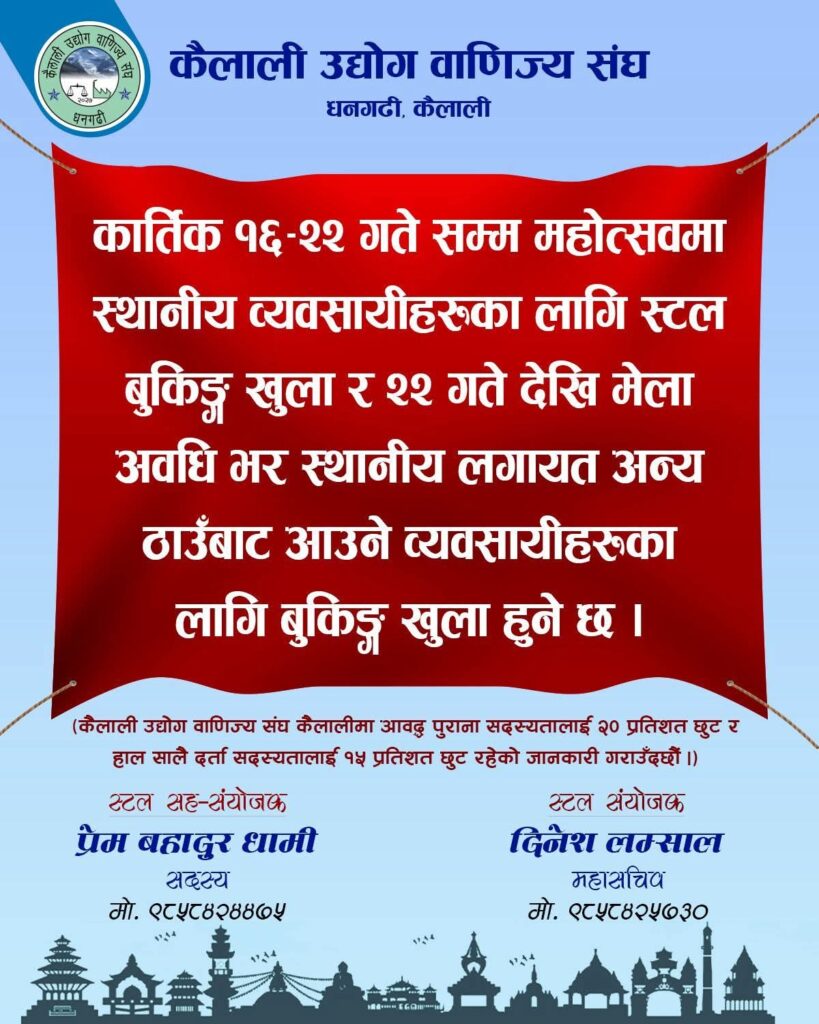 कैलाली उद्योग वाणिज्य संघको आयोजनामा हुने महोत्सवमा ५०० भन्दा बढी स्टल रहनेछन्, जसमा कृषि, उद्योग, हस्तकला, सूचना प्रविधि, इलेक्ट्रोनिक्स, होटल र घरेलु उत्पादन समावेश छन्। महिला उद्यमी र कृषकका लागि ५० स्टल निःशुल्क उपलब्ध गराइनेछ।